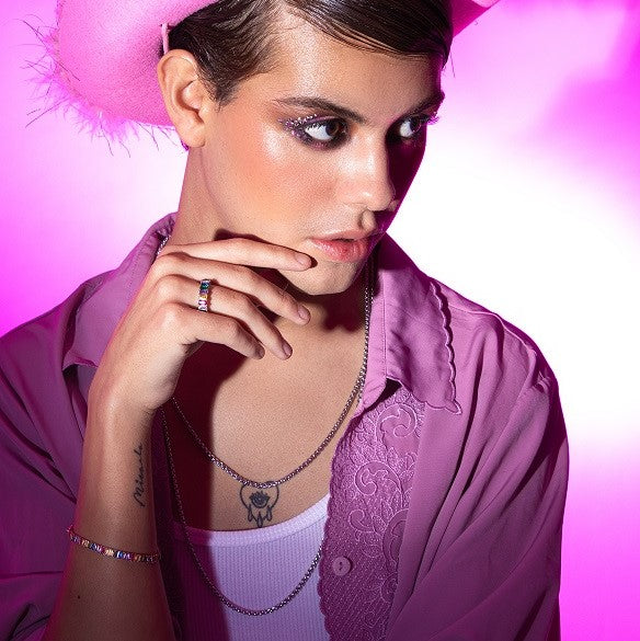 Anillo en bisutería con piedra zirconia de swarovski corte baguette multicolor, rodizado en plata. Libre de nickel.