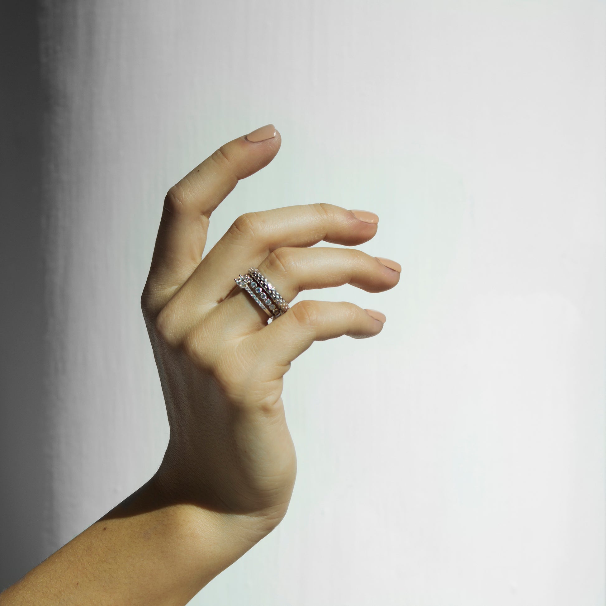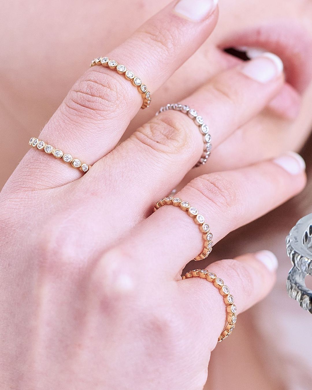 Anillo en plata de ley rodizado nuevamente en plata, con incrustaciones de zirconia cúbica blanca Swarovski al rededor de todo el anillo. Libre de nickel.